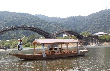 澄み渡る秋空の下、錦帯橋付近で秋の遊覧船「もみじ舟」が運航されます。屋形舟に乗…