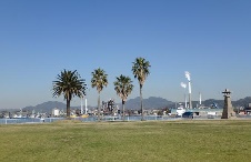 ヤシの木が並び、南国情緒あふれる臨海公園。徳山港を挟んで対岸には、工場やクレー…