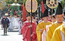 中洲の街が一丸となり、年に一度の感謝の夕べ「中洲まつり」が開催されます。まつりの華である「中洲國廣女みこし」と「花魁道中」が行われるほか、さまざまなステージイベントが各所で行われ、まつりを盛り上げます。中洲中央通りにも、飲食店や物販ブースが立ち並び、大勢の人で賑わいます。