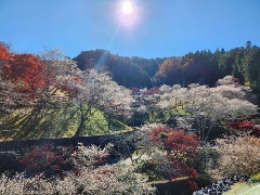小原地区では、例年11月中旬から下旬にかけて、四季桜が美しく咲き誇ります。四季桜は、年に2度開花することで知られ、小原地区には、約1万本の四季桜の木が植栽されており、各所で可憐な花を見ることができます。なかでも、川見四季桜の里には約1200本の桜の山があり、圧巻の景色が楽しめます。同時期に、美しい紅葉も見ることができます。