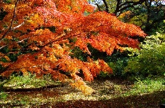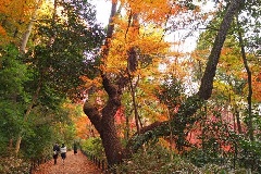 国立科学博物館附属自然教育園は、大都会の中心部にありながら、豊かな自然が残る憩いのスポットです。園内には、ケヤキ、ミズキなどの落葉樹、スダジイ、カシ類、マツ類などの常緑樹が広がり、ススキやヨシの草はら、池や小川などもあります。路傍植物園から水生植物園の間にある遊歩道のイロハモミジをはじめ、水面に紅葉が映るひょうたん池など、紅葉の見どころが点在します。