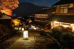 中山道の宿場のうち、江戸から数えて四十三番目にあたる馬籠宿を舞台に、「馬籠宿場まつり」が開催されます。夜には、街道に並べた行燈に明かりが灯される「あかり街道」が催されるほか、期間中の土日祝は、島田公園で「もみじのライトアップ」も実施されます。