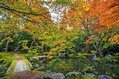 国の史跡および名勝に指定されている北畠氏館跡庭園は、例年11月になると、モミジやイチョウなどの美しい紅葉で彩られます。北畠氏の居城跡である霧山城跡も国の史跡に指定されているほか、館跡には村上源氏北畠家の北畠顕能を祀る北畠神社があり、紅葉のシーズンにはまるで真紅のじゅうたんを敷きつめたかのような景観が広がり、一層風雅な庭園となります。期間中は夜間ライトアップも行われ、幻想的な夜の紅葉を楽しむことができます。