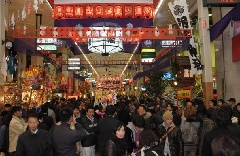 「えべっさん」の名で親しまれている胡子神社の秋季大祭が、3日間にわたり行われます。社殿の前には、賽銭箱として口の開いた大樽が置かれ、大判、小判、宝船などを飾りつけた縁起物のこまざらえが販売されます。20日に開催される本祭りまで、たくさんの参拝者で賑わいます。神社付近の商店街では「誓文払い」の大売出しが催され、お祭りを盛り上げます。