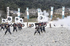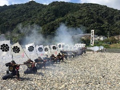 石田流の流れをくむ「岩国藩鉄砲隊」による訓練が、錦帯橋周辺で披露されます。隊長の号令のもと、広場に整列した隊員たちが火縄銃を発射し、城山に銃声の轟音がこだまします。全国的にも珍しい、鉄砲隊の演武を間近で見学できるほか、訓練後は記念撮影も楽しめます。