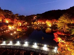 自然と文化のテーマパーク「修善寺虹の郷」では、例年11月中旬になると日本庭園や匠の村を約1000本のモミジが赤く染め上げます。カナダ村、フェアリーガーデンでは、黄金色に輝く洋風樹木が息を呑むほどの美しい景観をつくります。園内を周遊するロムニーバスの車窓から、紅葉狩りを楽しむこともできます。11月15日から12月14日まで「もみじライトアップ」が行われ、昼間とは異なる幻想的な雰囲気が演出されます。同時開催のイルミネーション「虹の郷イルミ the ナイト2025」も、あわせて観覧することができます。