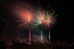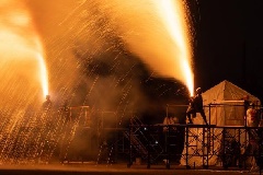 愛知県東三河地域に伝わる手筒花火は、火薬を詰めた竹筒を抱え、火の粉を体に浴びながら放揚する勇壮な花火です。約10mにもなる炎の柱は壮大なスケールで、観る者をを圧倒します。手筒花火を中心に、大筒や網火、仕掛花火、打上花火などが披露されます。