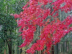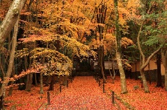 一休さんゆかりのお寺として知られる地蔵院では、例年11月中旬になると100mほどの参道両脇のモミジが色づき始めます。竹林で囲まれているため、通称を「竹寺」とも呼ばれ、紅葉の時季には、赤と緑のコントラストを楽しむことができます。