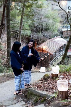 鹿教湯温泉の夜を美しく彩る「氷灯ろう夢祈願」が、文殊堂・薬師堂周辺で行われます。温泉街から湯端通りをぬけ、五台橋の屋根の下をくぐり、文殊堂への46段の階段から薬師堂周辺まで続く通りを、約200個の氷で作られた「氷灯ろう」にろうそくを灯して飾ります。もう一つの屋根付の橋「寺沢橋」から湯坂を望むと、立ち上る湯気が見え、幻想的な雰囲気がさらに盛り上がります。