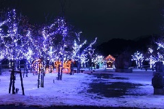 豊かな自然に恵まれた市民の憩いの場、中山池自然公園では、20万球の電飾によるイルミネーションが冬の夜をあたたかく照らします。クリスマスツリーやトナカイなどのオブジェが登場し、クリスマス気分が高まります。手づくりのイルミネーションは、心まで温かくなると好評です。