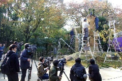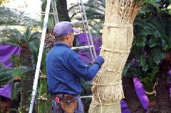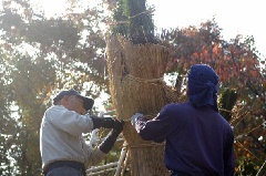 立冬の日の頃になると、広島県縮景園の37本の「そてつ」も冬支度に入り、防寒のために「コモ」を着せられます。暖かくなる3月末頃になると外されます。