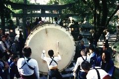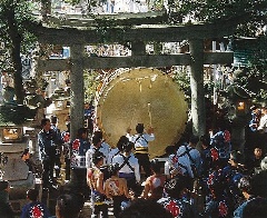 安全と豊漁祈願の「舞阪大太鼓まつり」は400年以上続く、旧暦9月14日と15日のすぐ後の土日曜に斎行される「岐佐神社」の例祭です。宵祭り(土曜)では、大太鼓や手踊りが、4町それぞれの地区を練り歩きます。本祭り(日曜)では、神輿渡御に伴い、岐佐神社から稲荷山の御仮屋まで約1.3kmを往復します。年番町の太鼓を先導役に、大小8台の太鼓、女子の手踊りも行列に加わり、宿場町の風情漂う道中を賑やかに練り歩きます。最大で約2.4mにもおよぶ大太鼓を、若者らが長さ1mほどもあるバチで、笛の囃子にあわせて勇壮に打ち鳴らします。太鼓がよく鳴れば鳴るほど神様が喜ぶと言われ、競い合ってたたく姿は、海に生きる男たちの心意気を示します。