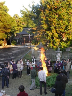 収穫に感謝し、長く寒い冬の間の健康や火災除けを願う神事「火焚祭」が、新日吉神宮で執り行われます。「火焚祭」は、京都の多くの神社で行われる秋の行事として知られ、大正時代までは、皇室でも皇居において天皇の御前で女官により行われていました。新日吉神宮では、午後3時からの本殿での祭典で、神楽女により優雅な「鈴の舞い」と「剣の舞い」が奉納され、その後、本殿前の火床で火焚串の焼納や、湯立神楽が厳かに舞われます。火焚の炎にあたると健康に恵まれるとされ、参拝者へは風邪よけの「焼みかん」と災難不浄除けの「笹まもり」が無料で配られます(いずれも数に限りがあり)。
