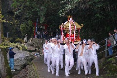 無病息災を祈願する祭りが、轟神社で行われます。御祈祷が午前中に行われ、神事終了後、轟神社から、白装束の男衆らが担ぐ暴れ神輿が出発します。140段の急石段を駆け下り、龍王寺の境内を通り、岩の間を抜けて、川を渡り、滝へと向かいます。秋の紅葉で染まる轟渓谷の、激しく水が落下する滝壷に、神輿が入る様は圧巻です。