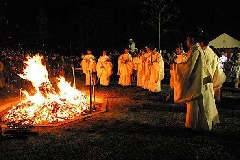 高千穂の峰に降りるニニギノミコトを、火を燃やして迎えたという故事に由来するお祭りです。高千穂河原古宮址の斎場において、夕闇が迫る頃、鑚り火(きりび)により採火した御神火を松明に移し、祈願札や絵馬が焼納され、国家安泰と国民の平安が祈念されます。