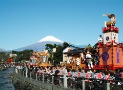 富士山本宮浅間大社の秋の例大祭の附け祭りでは、20台の山車や屋台が引きまわされるほか、市民による踊りの披露と多数の露店などで賑わいます。祭りの最大の見どころは、狭い道でどちらが道を譲るかを囃子で競うもので、「競り合い」と呼ばれます。4日には山車と屋台が勢揃いして本宮が行われ、多くの「競り合い」を楽しむことができます。浅間大社は、全国に1300余社ある浅間神社の総本宮で、富士山八合目から山頂までを所有し、この地に鎮座して1200年を超え、富士山文化の中心として発展してきた歴史と由緒ある神社です。