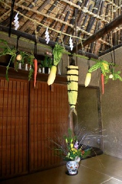 四国各地の伝統的なお正月飾りが、四国村ミウゼアムの各民家に飾りつけられます。神棚に魚や野菜を吊るす、香川県に伝わる珍しい飾りなどが見学できます。四国村ミウゼアムは、四国を中心に、各地から移築復原した江戸時代から明治時代にかけての民家や建造物が建ち並ぶ、古民家の屋外博物館です。