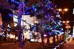 浜田駅前の歩道から万灯山公園にかけて、街路樹や公園内の木々にイルミネーションが設置され、冬の街並みが鮮やかに彩られます。2025年度は、シンボルツリーである高さ10mのヒマラヤ杉に、動きのある光の演出が加わり、季節やイベントによって異なる演出のイルミネーションを楽しむことができます。
