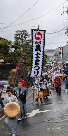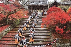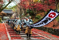 大石内蔵助が山科に隠棲した史実にちなみ「山科義士まつり」が開催されます。討ち入りの装束を纏った義士隊四十七士の行列が、毘沙門堂、瑞光院、岩屋寺、大石神社と、ゆかりの名所などを巡りながらパレードします。巡行途中の京都市東部文化会館では「刃傷松の廊下」をはじめ、討ち入りの場面を再現したパフォーマンスが行われます。