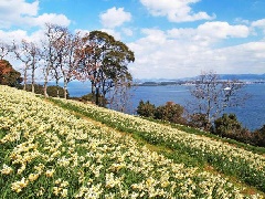 博多湾と福岡市を一望できる能古島の自然公園「のこのしまアイランドパーク」では、例年12月から2月にかけて、日本水仙が見頃を迎えます。約10万本の可憐な水仙が海沿いの斜面を埋め尽くし、園内は上品な香りに包まれます。博多湾の美しい風景をバックに、水仙畑の散策が楽しめます。