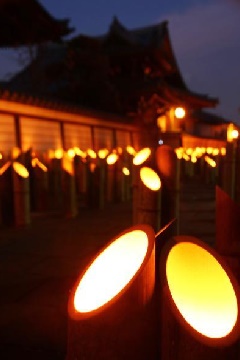 晩秋の夕暮れ時に、竹ぼんぼりのろうそくに明かりが灯されると、臼杵の情緒漂う古い町並みが浮かび上がり、訪れた人々を幻想の世界へ誘います。臼杵石仏を作ったとされる、真名長者の一人娘の般若姫の御霊が里帰りしたときに、里人たちが竹ぼんぼりを灯して迎えたという伝説にちなんだ、「般若姫行列」が行われます。神社の境内やお寺では、毎年趣向を凝らした竹のオブジェなどが展示されます。