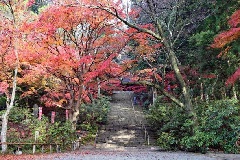 室生寺では、例年11月中旬になると、太鼓橋から本堂(潅頂堂)にかけて、モミジやイチョウなどが赤や黄色に色づき、秋ならではの美しい景色が広がります。歴史的建造物と、境内の紅葉との取り合わせも見事です。塔の左の道を登ると、御影堂(重要文化財)のある奥の院へと続きます。
