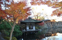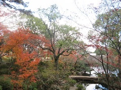 紅葉渓庭園(もみじだにていえん)はその名の通り、紅葉の名所として知られ、例年11月下旬になると、イロハモミジなどの色鮮やかな赤色で染まります。堀のなかに浮かぶ釣殿「鳶魚閣(えんぎょかく)」が情緒を醸し出すほか、木造銅板葺きの屋根が美しい「紅松庵(こうしょうあん)」ではお茶をいただくこともできます。
