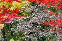 紅葉と同時に、年に2度花を咲かせる四季桜を愛でる「桜と紅葉まつり」が、普門寺周辺で開催されます。紅葉の燃え立つような赤と、四季桜の可憐なピンクのコントラストが楽しめます。期間中は音楽ライブや写真展、個展、土日を中心に日替わり出店などもあります。普門寺では、桜と紅葉お守りと御朱印帳の授与のほか、土日限定で花手水(はなちょうず)なども行われます。※2025年は仁王門が修繕中のため、期間中、拝観することはできません。