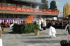 参拝者の願いが込められた数千本もの火焚串を忌火で焚き上げる神事が、城南宮で執り行われます。「大祓の詞」を全員で唱えて、無病息災、家内安全を祈願します。世の平穏無事を祈る「浦安の舞」も奉納されます。