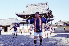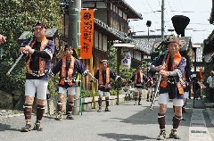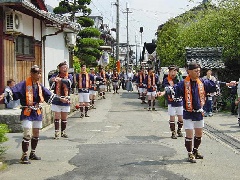 福田寺で、滋賀県の無形文化財に選択されている「公家奴振り」が奉納されます。紺のハッピに脚袢、ワラジ履きの公家奴が、「ヨーイヤセ、アレワイサノサ」のかけ声とともに町を練り歩きます。毎年、春と秋に催され、春は熊野神社参道で行われます。