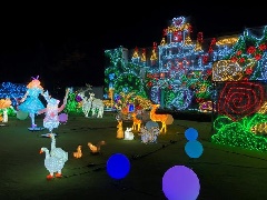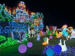 樫山工業株式会社による冬恒例のイルミネーションが、今年も開催されます。2025年は「不思議の国のアリス」をテーマに、作中のエピソード「涙の池」をたくさんのボールで表現したイルミネーションや、小瓶の上でバランスをとるコミカルなポーズのアリスなど、さまざまなイルミネーションが楽しめます。国道沿いの中ほどには、藤棚をバックに、2024年に製作したアリスと、時計を持った白ウサギなどのキャラクターも登場します。光が創り出すアリスの世界に、どっぷりと浸ることができます。