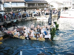 国ゆずりの神話にちなむ古代色あふれる出雲地方の代表的神事「諸手船神事」が、美保神社で行われます。樅の大木をくり抜いた古代の丸木舟を思わせる「諸手船(もろたぶね)」2隻が、互いに海水をかけあいながら港内を巡り競争します(14時頃~16時頃)。
