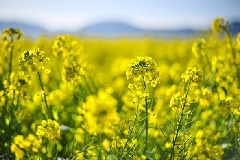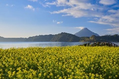年間平均気温が19度と温暖な指宿では、例年12月下旬から2月上旬にかけて、市内各地で菜の花が開花し、一足早い春を感じさせます。最盛期の1月には、約1000万本の花が、雄大な開聞岳や九州最大のカルデラ湖・池田湖を背景に咲き誇り、見事な景観を見せます。澄み渡った青い空と黄色いじゅうたんの絶景は一見の価値があり、日本で最も早い菜の花畑を見ようと、県内外から観光客が訪れます。見頃にあわせて「いぶすき菜の花マラソン」も開催されます。