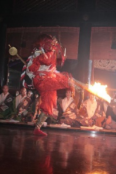 天下泰平と五穀豊穣を祈る恒例の行事が、書寫山圓教寺で執り行われます。式中、若天(赤鬼)は松明と鈴を鳴らし、乙天(青鬼)は宝剣をかざして勇壮に踊ります。若天は毘沙門天の化身、乙天は不動明王の化身とされ、鬼ではなく山の守護神であるので、どちらも角がありません。この日は、一年に一度、摩尼殿の本尊「六臂如意輪観世音菩薩像」が御開帳されます。