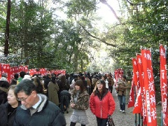 日前・國懸神宮の「えびす詣り」では、宵えびす、本えびす、のこり福の3日間にわたり、参道が深紅の市戎のぼりで鮮やかに彩られ、夜遅くまで境内が開放されます。大小さまざまな縁起物が用意され、家運隆昌、商売繁昌を願う人々で賑わいます。かつては芸者衆はじめ、えべっさんの縁起にあやかりたい大勢の人々が「宝恵(ほえ)かご」に乗って参拝したといわれます。