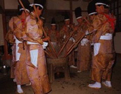 多井畑厄除八幡宮で、1月18日からはじまる厄除大祭の御供物として奉る、餅つきの神事が行われます。古来より社家八人神主役で行われ、現在では氏子から8人が選ばれます。選ばれた氏子は身を清め、長さ1間ほどの樫棒を持ち、臼の東西に4人が相向かい「エイトエイト」の掛け声も勇ましく、8本棒で餅をつきます。1月18日の早朝には氏子総代が集まり、伝来の式に則り、みかん、干柿、長芋、栗、梅枝などを餅に積んで神前に献じます。※状況により変更となる場合があります。