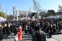 大晦日17時から大祓式と除夜祭、23時15分から樽酒奉納奉告祭が行われた後、元旦0時から初神楽奉奏(巫女舞)が行われ、新年の幕開けを祝います。1日は歳旦祭と吟詠奉納、2日は二日祭と尺八奉納、3日は元始祭と射礼、謡曲奉納が斎行されます。正月三が日は、約60万人の参拝者が訪れ、御神酒の振る舞いもあり、境内は大いに賑わいます。※参拝の際には、ホームページ「初詣情報」をご確認ください。