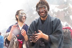 前年に結婚した婿を、薬師堂から5m程下の雪上へと投げるという荒っぽい行事が、松之山温泉で行われます。むこ投げ後は、賽の神を燃やした灰と雪を混ぜて墨を作り、「おめでとう」と言いながら、誰彼となくお互いの顔に塗りあいます。