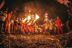 日本三大火祭りの一つとも言われる「野沢温泉の道祖神祭り」が、馬場の原で開催されます。13日に山からご神木が運ばれ、15日の昼までを費やし社殿が作られます。同日19時頃から火打ち石で採火した火をつけた松明が運ばれ、20時頃から火祭りが始まります。火をめぐる攻防戦は22時過ぎまで行われ、最後に社殿に火が入れられます。次第に大きくなる炎が空高く燃え上がると、祭りはクライマックスを迎えます。国の重要無形民俗文化財に指定されています。