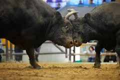 宇和島定期闘牛大会の正月場所が、市営闘牛場で開催されます。1t級の牛と牛が闘う真剣勝負は、迫力満点です。荒々しい牛の息づかいや、甲高い勢子(せこ)の声、角と角がぶつかり合う音が館内に響き、白熱の戦いが繰り広げられます。