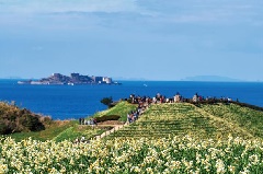 長崎半島の先端に位置する「長崎のもざき恐竜パーク」内の水仙の丘で、例年1月下旬から2月中旬にかけて、スイセンが開花します。まばゆい花景色の向こうには、海に浮かぶ世界文化遺産の軍艦島が望めます。スイセンの芳香と潮風のまざりあった独特の香りが印象的で、環境省の「かおり風景100選」に選ばれています。