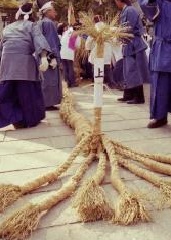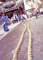 氏子たちが綱を引き合い、勝った方がその年の福を得るとされる年占いの神事が、難波八阪神社で行われます。祭神である素戔鳴尊(すさのおのみこと)が、八岐大蛇(やまたのおろち)を退治し、民衆を苦難から救ったという故事に基づき始められたとされます。この綱引神事は、「摂津名所図絵」や「摂津名所図会大成」にも紹介されているほか、2001年に無形民俗文化財にも指定されています。