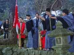 源氏に見立てた的に矢を射る行事「百手の儀式」が、毎年1月28日に平内神社で行われます。門脇、伊賀、矢引の三氏の武士に扮した若者が、平家の旗を持って神社へ向かい、境内の大イチョウにくくりつけた的に101本の矢を射ます。平家再興を望む武将たちが、武技の向上を祈願して始めたものと伝わります。