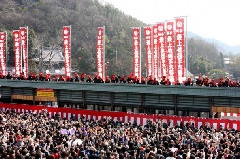 最上稲荷の三大祭典の一つ「節分豆まき式」が開催されます。午前10時より本殿にて、開運厄除けの祈祷の後、豆まき式が行われ、総勢約750人の福男や福女、タレントが、長さ85mの結界廊から約10万袋の福豆を投じます。多数の豪華福品も用意され、多くの参拝者で賑わいます。