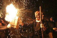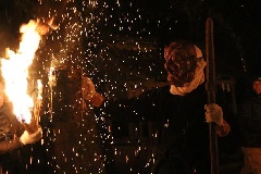 御井神社で、「古鬼面」をかぶった鬼を燃えさかる松明で追い払う、珍しい火祭りが行われます。境内で氏子が円形に並び、「まーいっそうない」と掛け声をかけながら、鬼が持つ木箱に松明をぶつけます。はげしく火花が散り、幻想的な雰囲気が醸し出されます。<夜はバスの運行がないためご注意ください。>