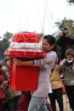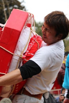 「力餅」は、本尊の初会式の行事として、毎年1月第3日曜に大山寺境内で行われます。男141kg、女70kg、小学生57kg、幼児17kgの餅をかかえ、歩いた距離を競います。見物する人も思わず力が入る名物行事です。「力餅」に先立ち、境内にて、柴燈大護摩供と火渡りが執り行われます。