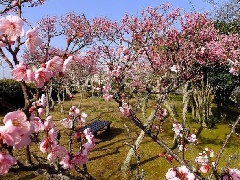 常盤湖を中心に、緑と花と彫刻に彩られたときわ公園では、例年1月下旬から2月下旬にかけて、梅が見頃を迎えます。赤、白、ピンクの約100本が咲き誇り、青空と梅の美しい風景が広がります。白加賀、緋梅系、野梅系、豊後系など、多彩な梅を楽しめます。