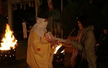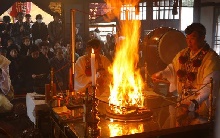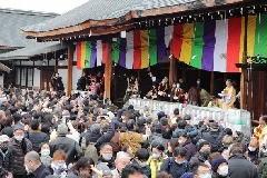 修験道、厄除けのお寺として知られる聖護院で、節分会が行われます。追儺式では、暴れだした赤・青・黄の3匹の鬼が山伏の法力などにより調伏され、最後には改心するという修験道らしいストーリーです。その後に行われる豆まきでは、改心した鬼たちも一緒に豆を撒きます。外で焚かれる厄除開運採燈大護摩供では、多くの山伏たちが集まり祈りを捧げます。この護摩で行われる弓、剣、斧の修験道独特の作法は興味深いもの。節分の両日は、通常は非公開の宸殿の一部が公開されます(法要中は休止)。