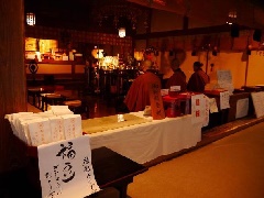 三千院では旧正月にあたる節分の日の9時より、僧侶が般若心経を一年の日数分(日数心経)唱え、息災を祈ります。立春、立夏、立秋、立冬に移る時をすべて節分といい、季節の変わり目にあたり古くは物忌をしていたものが、いつしか立春に限るようになり、「追儺(ついな)」疫鬼を駆逐し、邪霊の侵入を防ぐための行事が主流となりました。福豆の無料授与と不動堂前にてぜんざいの無料接待も行われます。