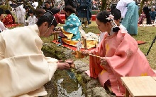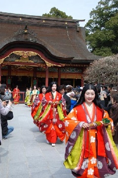 太宰府天満宮境内と参道周辺で、梅の花が咲く頃の恒例行事「門前まつり」が開催されます。参道と門前町には土産店や食事処など多くの店が立ち並び、参拝客をもてなします。平安の装束を纏った参宴者が歌を詠み、盃をかわす優美な「曲水の宴」をはじめ、「池坊華展」、「梅上げ行事」、太宰府門前まつりスタンプラリー、門前まつりフェア、古代米入り梅ヶ枝餅プレゼント、大宰府伝統民芸品「木うそ」の無料絵付け体験など、さまざまな催しも行われます。※詳細はホームページ参照